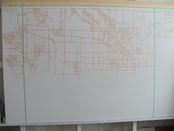 A suggestion of a map of Toronto is in the background, again it relates to growth and development. The painting in the background area will act as a textured membrane of Toronto and subtly focusing on the green spaces and some particular sections of the city.